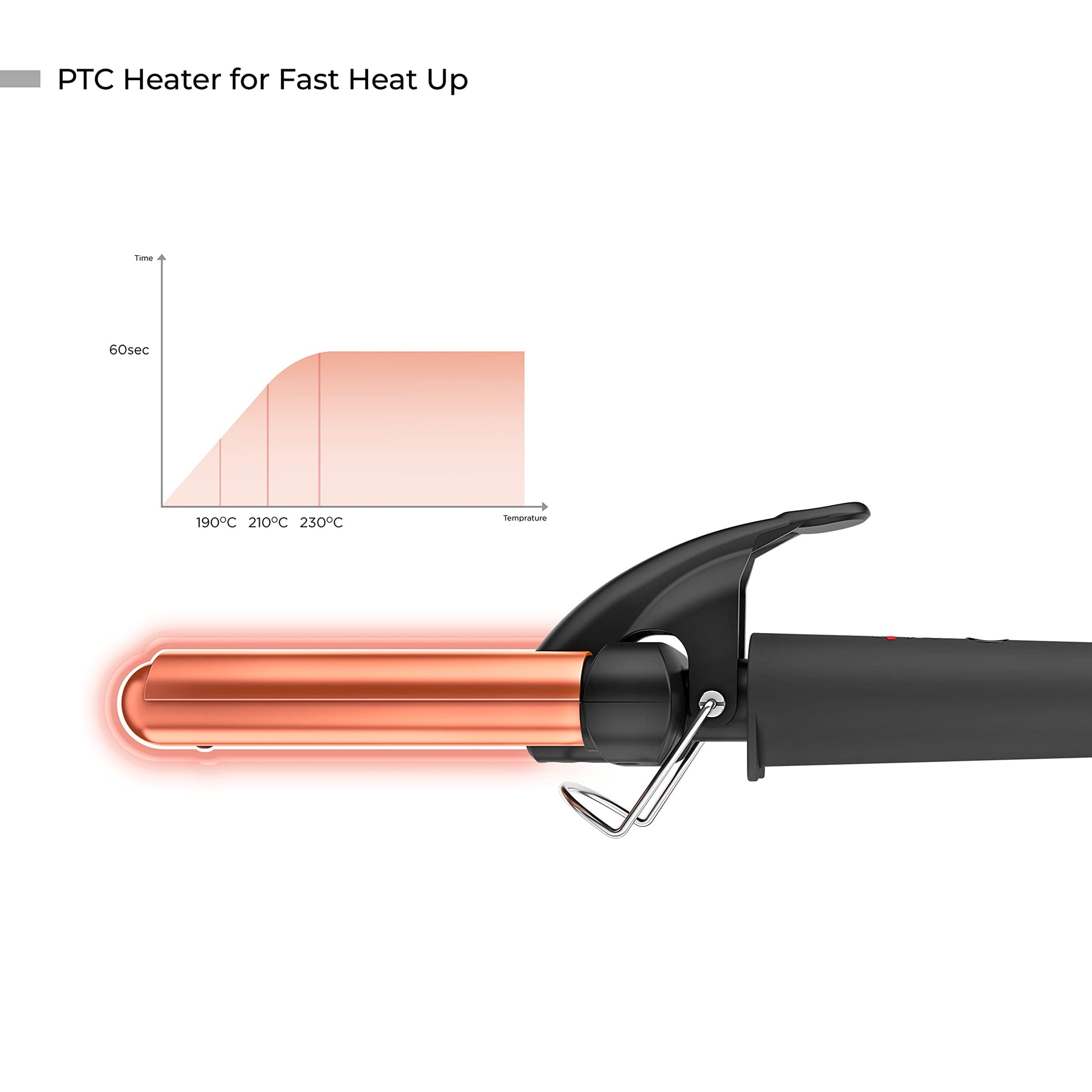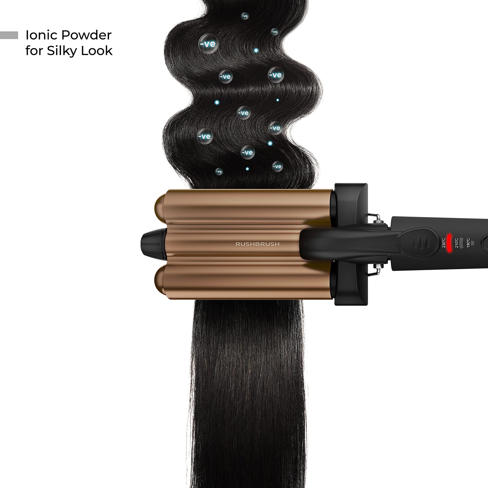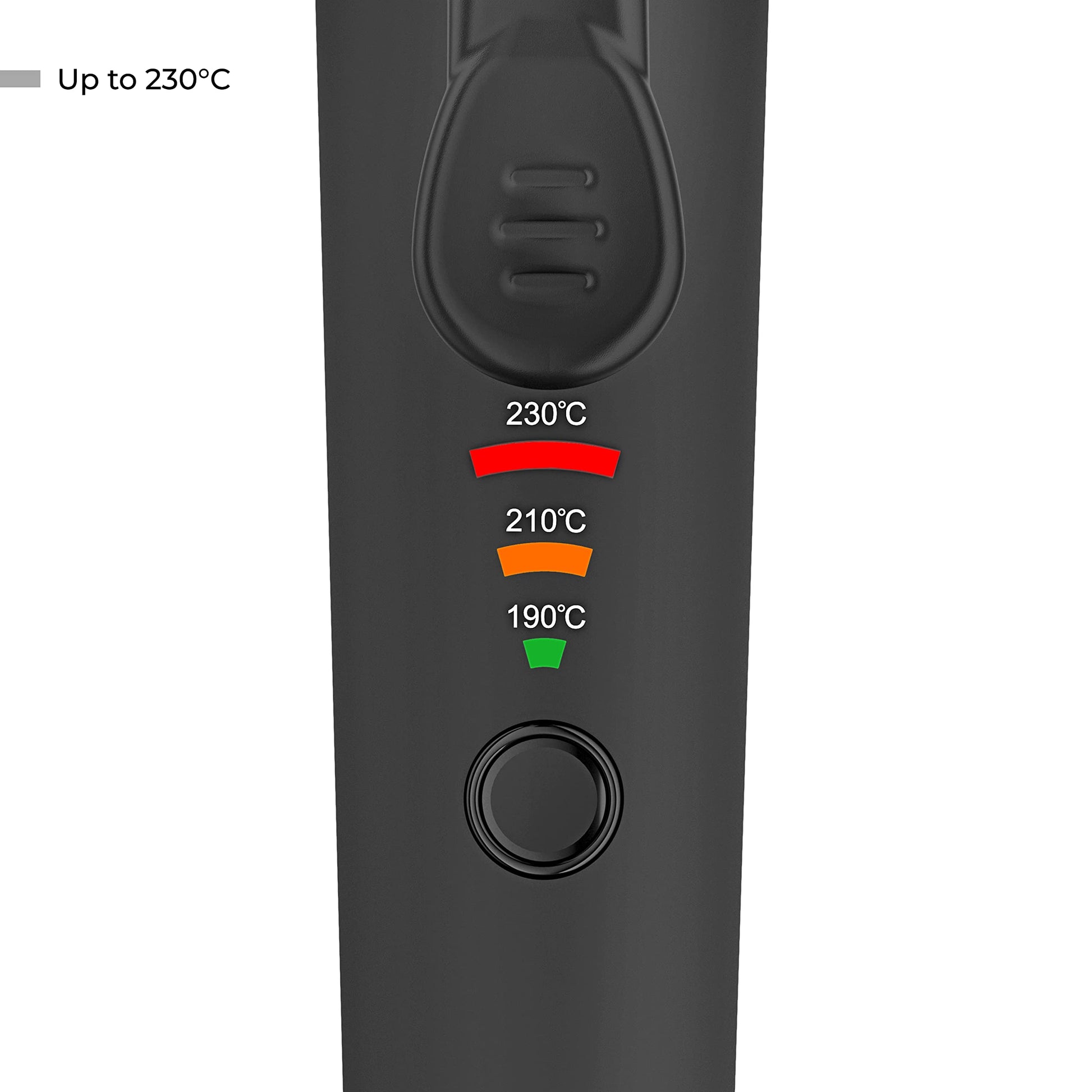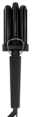 اداة تجعيد الشعر ام2 بلس 3 المكونة من اسطوانات التيتانيوم، تعمل بتقنية الايونات، مع درجة حرارة تصل الى 230 مئوية، بلون اسود، راش براش