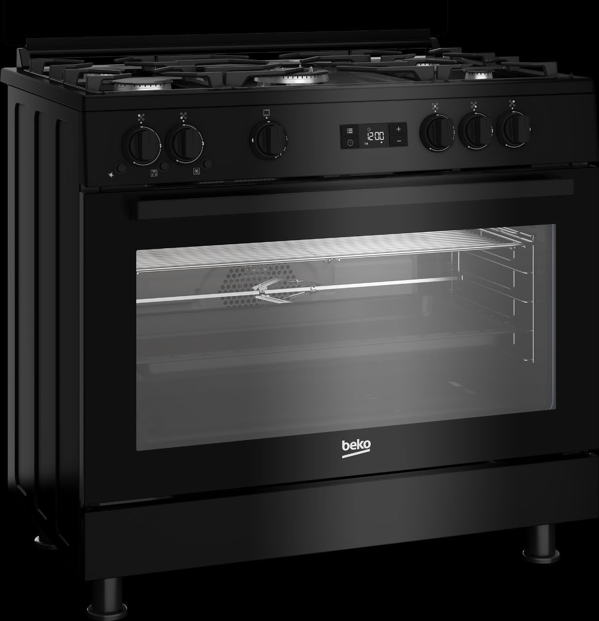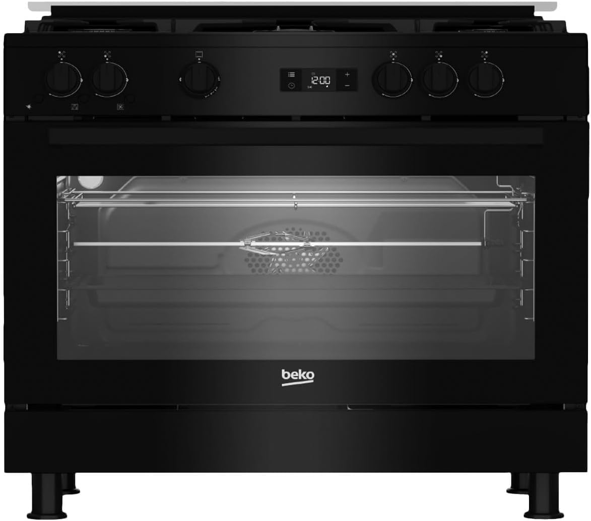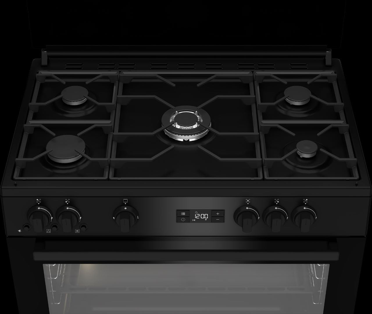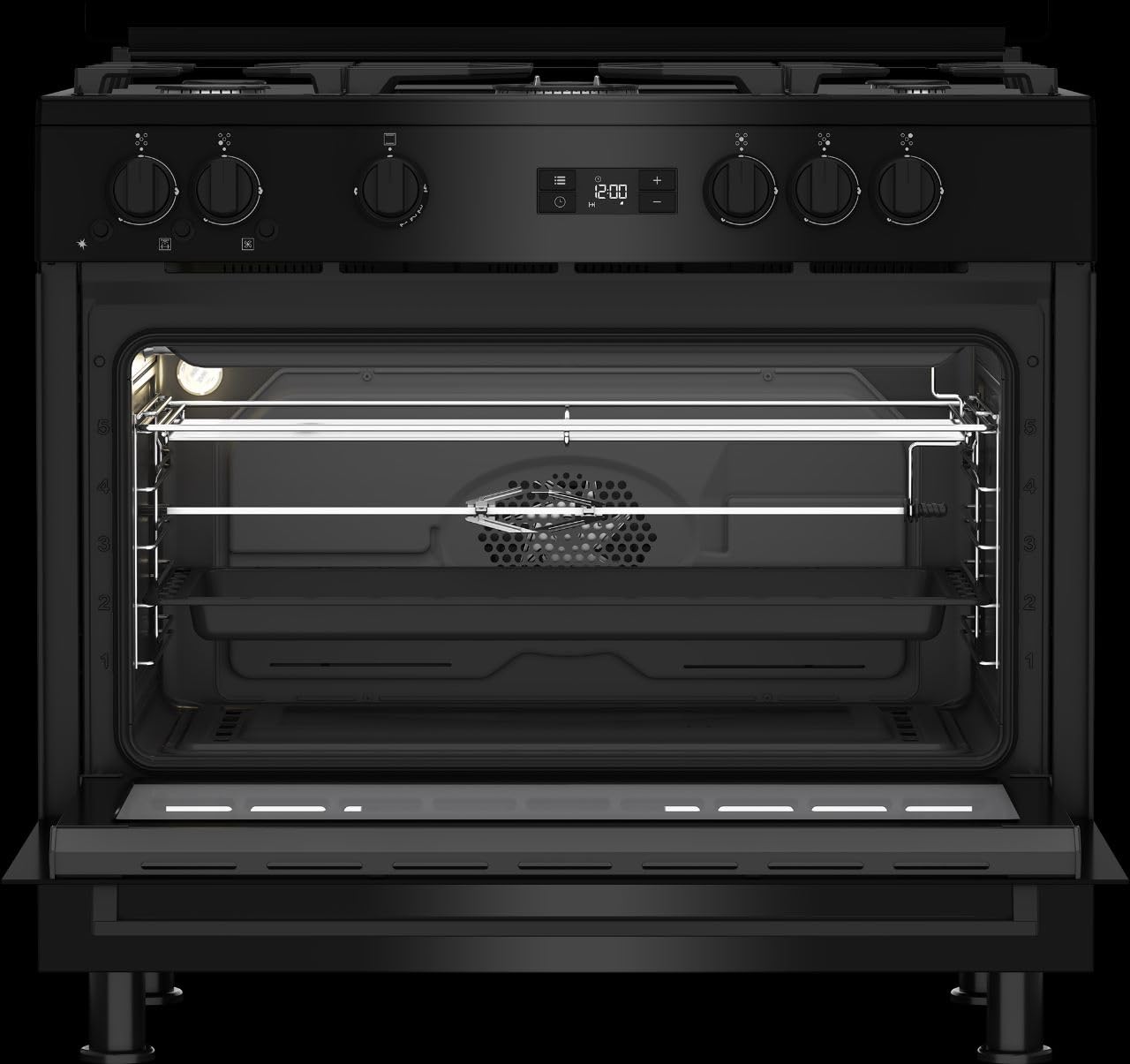 بوتاجاز غاز وفرن من بيكو، مقاس 90 سم، 5 شعلات وشواية غاز، مروحة تبريد ومروحة توزيع، إشعال مدمج، شاشة ديجيتال، قائم بذاته - GGR 15325 DX NB