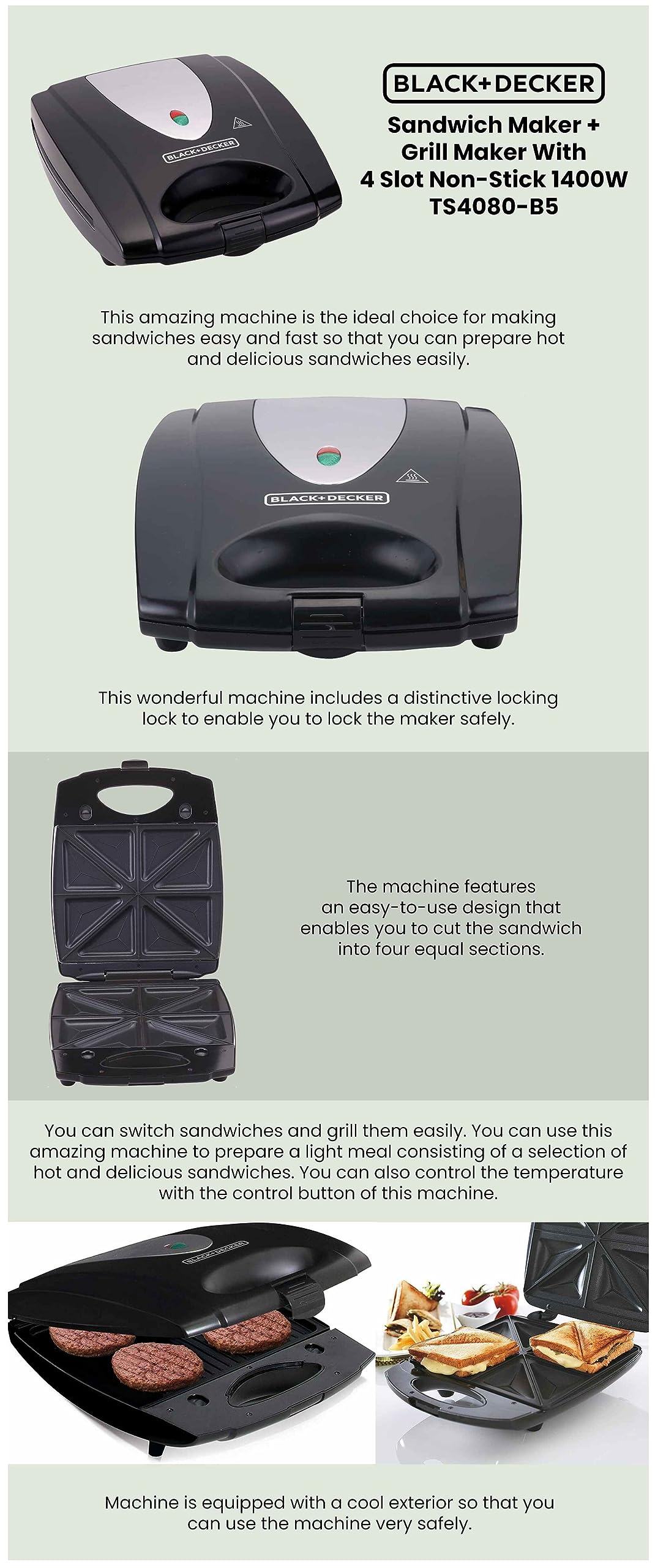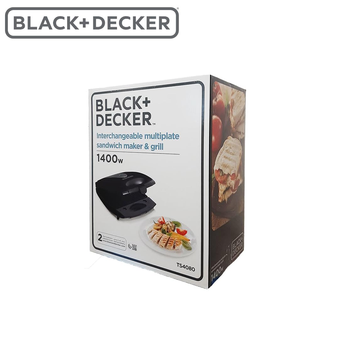 ماكينة صنع الساندويتشات من بلاك اند ديكر 1400 وات بـ4 فتحات، غير لاصقة، قابلة للتبديل، شواية مع مؤشر تحكم في الترموستات، جاهزة للطهي، لصنع الوجبات السهلة، TS4080-B5